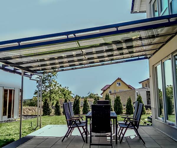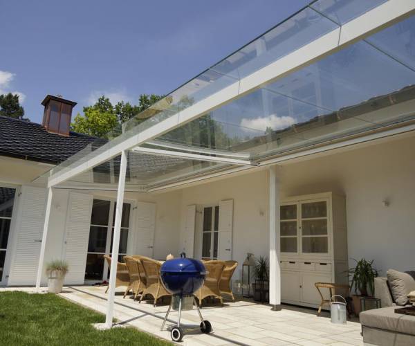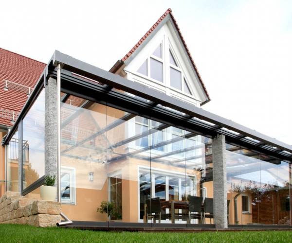wir realisieren in diesem System Spannweiten bis 4m bei Verwendung von 10,76mm VSG-Glas. Im Stützbalkenprofil sind Laufschienen für eine evtl Schiebetürverglasung von Haus aus integriert, sodass ein Ausbau zum Kaltwintergarten spielend auch nachträglich möglich ist.
